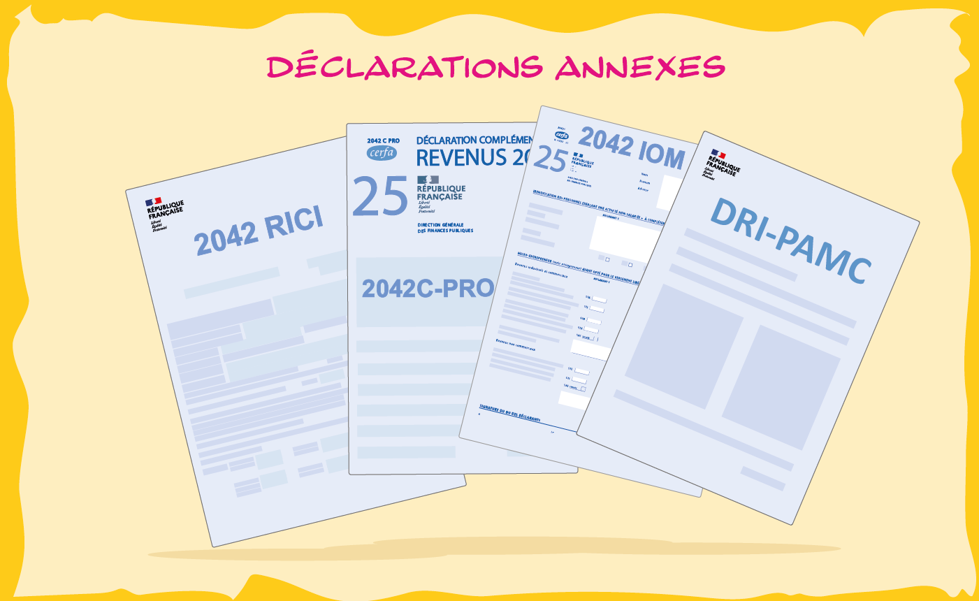 Résultat : le formulaire 2042 est complété de nombreuses annexes, qui sont également à remplir. Parmi elles : les déclarations 2042-C-PRO, 2042-RICI, 2042-IOM ou encore la déclaration sociale DRI-PAMC (ex DS-PAMC)…